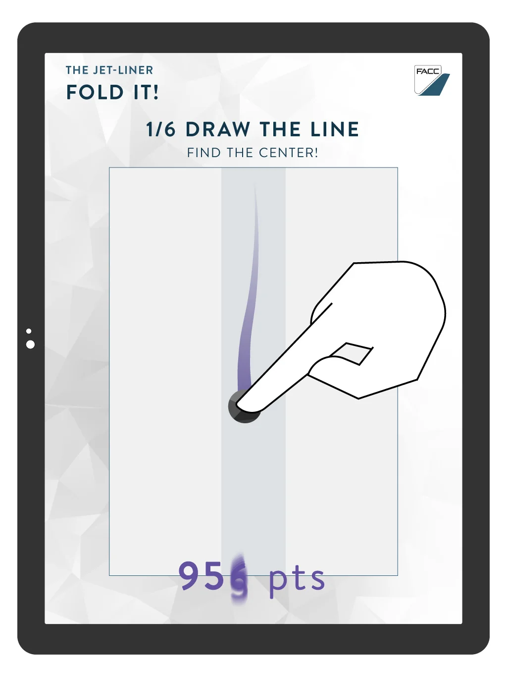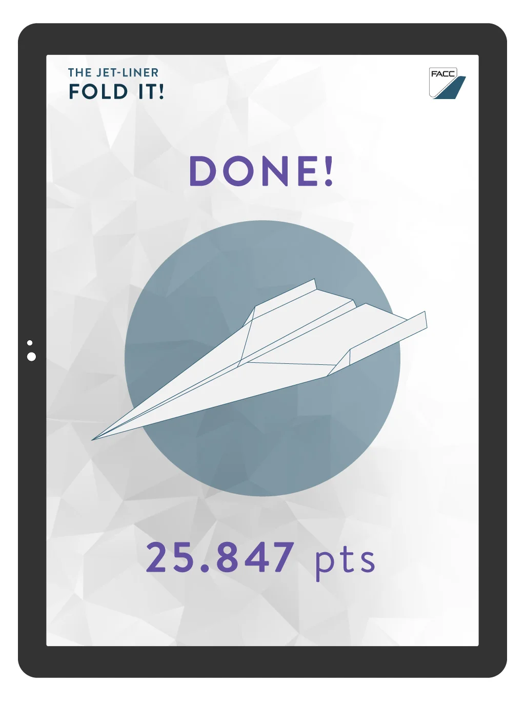 Das zweite Konzept sieht ein mobile Game vor, bei dem es darum geht, virtuelle Papierflieger zu bauen. Das Gameplay besteht aus einer Art Rythm-Game, wobei man versucht, die am Screen angezeigten Faltanweisungen möglichst genau und schnell durchzuführen. Je präziser und schneller, desto besser wird der Flieger. Am Ende startet der/die SpielerIn den Flieger auf eine virtuelle Reise. Die Strecke wird schließlich auf einem globalen Leaderboard vermerkt.