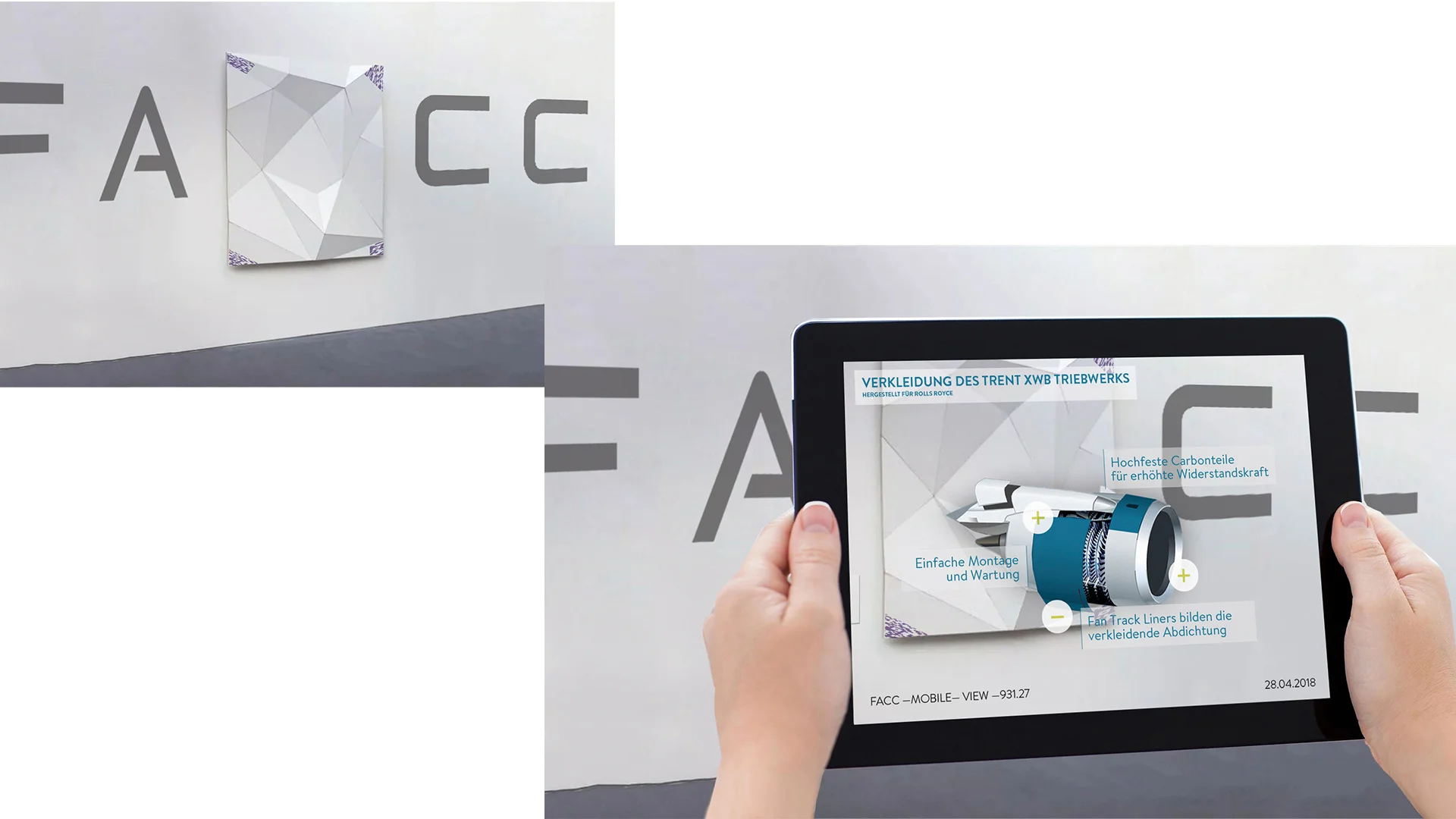 Um die oben genannten Ziele zu erreichen, wurden nun zwei Konzepte entwickelt. Das eine ist eine Augmented Reality App für mobile Geräte. Diese wird speziell auf Messeständen eingesetzt. Sie präsentiert die Produkte und Fertigungstechniken vom FACC auf eindrucksvolle Art und Weise.
